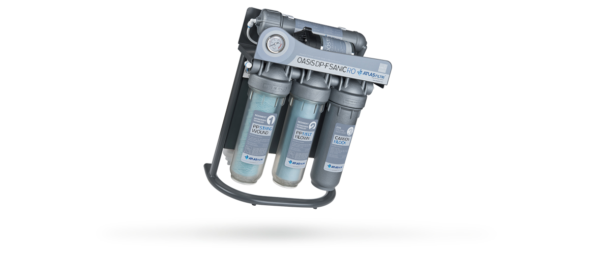 Atlas Filtri出品的具有抗菌技术的OASIS DP-F SANIC反渗透过滤器,通过反渗透过程结合抑菌手段处理饮用水。